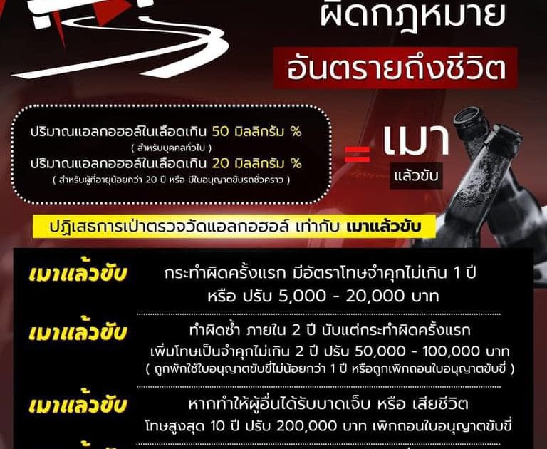 เมาแล้วขับ – หากทำให้ผู้อื่นได้รับบาดเจ็บ หรือ เสียชีวิต โทษสูงสุด 10 ปี ปรับ 200,000 บาท เพิกถอนใบอนุญาตขับขี่