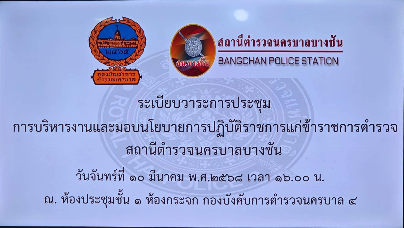 จัดกิจกรรมการประชุมการบริหารงานและมอบนโยบายการปฏิบัติราชการแก่ข้าราชการตำรวจ สถานีตำรวจนครบาลบางชัน เพื่อเป็นแนวทางในการปฏิบัติหน้าที่ และแนะนำข้าราชการตำรวจที่เข้ามาดำรงตำแหน่งใหม่
